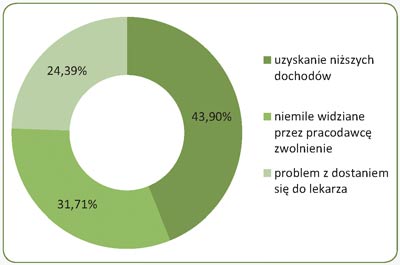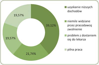 W dwóch badanych przedsiębiorstwach koszty związane z obniżoną wydajnością ze względu na obecność chorych pracowników w pracy są od 1,5 do 6 razy wyższe niż koszty pośrednie absencji (w przedsiębiorstwach 1 i 3 w zależności od kalkulacji). Do tego, z punktu widzenia pracownika, dochodzi problem rezygnacji ze zwolnienia lekarskiego na rzecz urlopu wypoczynkowego. Najczęstszą zidentyfikowaną w badanych przedsiębiorstwach przyczyną, dla której pracownicy pozostawali na urlopie wypoczynkowym lub też przychodzili do pracy pomimo choroby były niższe dochody związane ze zwolnieniem lekarskim (rys. 2. i 3.). Możliwość uzyskania niższych zarobków w przypadku zwolnienia lekarskiego została zidentyfikowana również przez innych badaczy jako główna przyczyna obecności w pracy chorych pracowników [5].