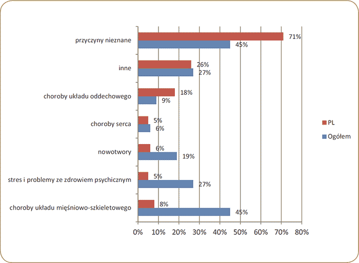 Wyniki ESENER pokazują, że w blisko 38% polskich przedsiębiorstw analizuje się rutynowo przyczyny absencji chorobowej, co plasuje Polskę na 21. miejscu wśród 31 badanych państw. Ale już wyniki badań przeprowadzonych przez firmę Mercer głównie w dużych i bardzo dużych korporacjach międzynarodowych działających na terenie Polski pokazują, że nieznane są przyczyny ponad 70% przypadków absencji długoterminowej, podczas gdy w całej badanej populacji odsetek przypadków, w których przyczyny absencji długoterminowej nie są znane, jest o 25% niższy (rys. 1.). Mercer zidentyfikował dwie podstawowe przyczyny absencji długoterminowej: choroby układu mięśniowo-szkieletowego (45% przypadków) oraz stres i problemy ze zdrowiem psychicznym (27%). Wyniki te znajdują potwierdzenie w innych badaniach prowadzonych w tym zakresie [7-10]. Tymczasem dla Polski odsetki te wynoszą odpowiednio 8 i 5%, co może świadczyć o niedostatecznym zidentyfikowaniu problemu przez pracodawcę (rys. 1.).