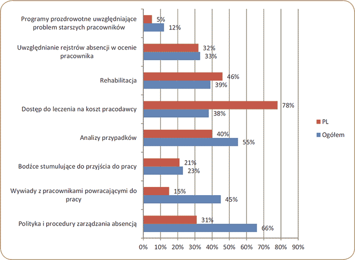 Z badania przeprowadzonego przez Mercer wynika, że najpowszechniejszym instrumentem zarządzania absencją chorobową w Polsce jest zapewnienie pracownikom dodatkowych świadczeń medycznych (78% przypadków), podczas gdy we wszystkich 10 badanych państwach odsetek ten kształtuje się na poziomie 38% (rys. 2.). Za najistotniejsze z punktu widzenia skutecznego zarządzania absencją chorobową uznaje się w całej badanej populacji ustanowienie polityki zarządzania absencją chorobową oraz odpowiednich procedur (66% w całej badanej populacji, w Polsce 31%). Za istotne uznaje się również analizowanie indywidualnych przypadków absencji (55% w całej badanej populacji, 40% w Polsce) oraz prowadzenie wywiadów z pracownikami po-wracającymi do pracy (45% w całej populacji i tylko 15% w polskich przedsiębiorstwach).