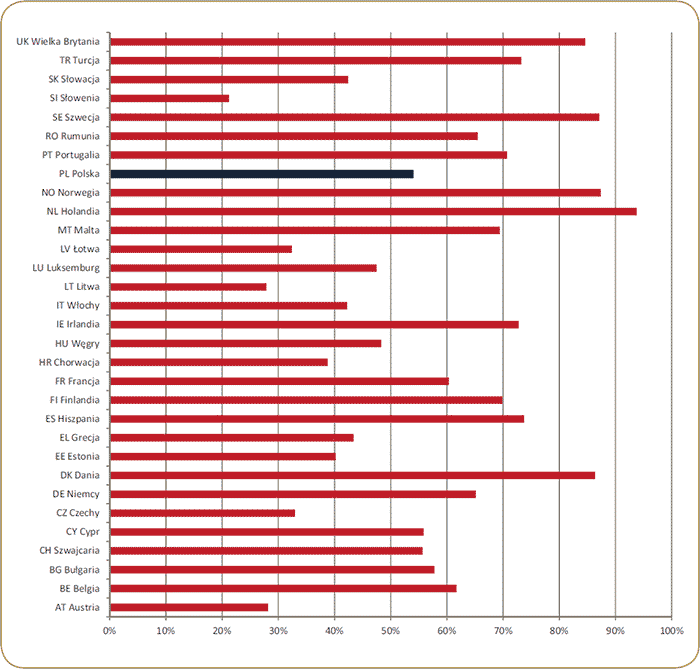 Rys. 5. Odsetek zakładów pracy, które regularnie monitorują stan zdrowia pracowników, ESENER2009
