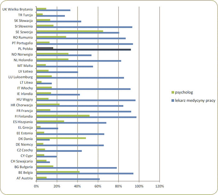 W ponad 90% polskich przedsiębiorstw w działaniach skierowanych na zapewnienie pracownikom bezpiecznych i higienicznych warunków pracy uczestniczy lekarz medycyny pracy, co stawia Polskę na 6. miejscu wśród badanych państw. Udział psychologa zaś za-deklarowało jedynie 16% badanych, podczas gdy w państwach skandynawskich należących do UE odsetek ten wynosi 40 - 60% (rys. 4.).