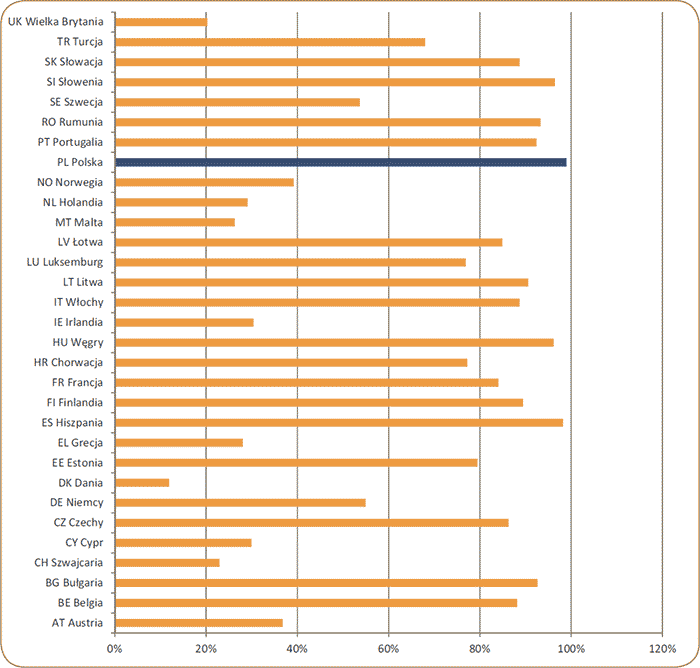 Jak wynika z badań ESENER, blisko 99% polskich pracodawców przyznaje, że regularnie monitoruje zdrowie swoich pracowników (rys. 5.), co stawia Polskę na pierwszym miejscu wśród państw europejskich.