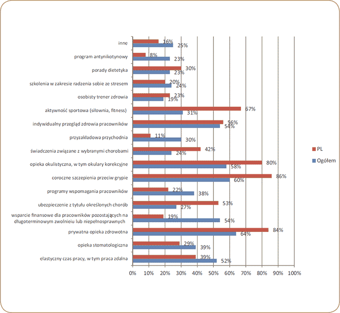 Z działań prozdrowotnych podejmowanych przez pracodawców Polska zdecydowanie przoduje w oferowaniu prywatnej opieki medycznej, w tym szczepień ochronnych przeciwko grypie i opieki okulistycznej (ponad 80% badanych) oraz dofinansowaniu do aktywności fizycznej (67%). Niewielkim zainteresowaniem cieszą się natomiast pro-gramy pomagające rzucić palenie, wsparcia finansowego dla pracowników pozostających długo na zwolnieniu lekarskim bądź też pracowników niepełnosprawnych czy szkolenia w zakresie radzenia sobie ze stresem (rys. 6.).