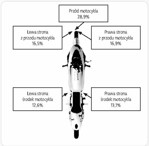 Wg danych MAIDS, podczas analizowanych wypadków, najczęstszymi miejscami zderzeń motocykli z innymi obiektami były: przód motocykla (29%), lewa i prawa strona przodu motocykla (ok. 17%) oraz środek motocykla (ok. 13%), (rys. 1.), [3].
