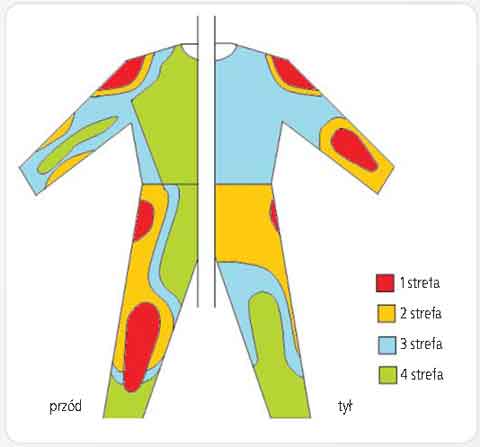 Rys. 2. Strefy zagrożenia uszkodzeń ciała motocyklisty w wyniku zderzeń i ścierania wg normy PN-EN 13595-1:2005 [8]