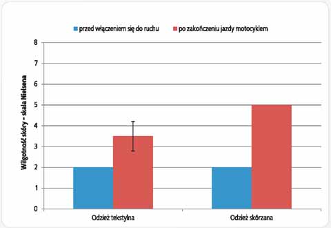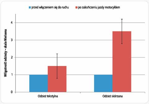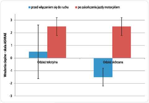 Analizując uzyskane dane można stwierdzić, że praktycznie w każdym przypadku nastąpiło pogorszenie odczuć subiektywnych dotyczących zarówno wrażeń cieplnych, jak i wilgotności skóry i odzieży. W przypadku wrażeń cieplnych (rys. 3.), z poziomu odczuwania komfortu cieplnego (dla odzieży tekstylnej), po zakończeniu jazdy motocyklem, obserwowano wzrost ocen do prawie maksymalnego poziomu +3 (gorąco). Wielopunktowy wzrost oceny wrażeń wilgotności skóry i odzieży, a tym samym pogorszenie odczuć subiektywnych, odnotowano zarówno dla odzieży tekstylnej jak i skórzanej.