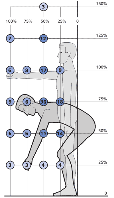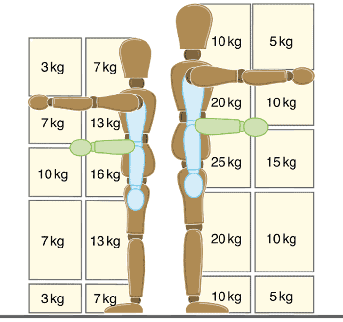Możliwość utrzymania na przykład pozycji pochylonej lub z ramionami wyciągniętymi do przodu lub do góry ma wpływ na zdolność do podnoszenia ładunków umieszczonych nisko lub wysoko. Jednak wysokość umieszczenia ładunków określona w centymetrach [cm] od podłoża nie jest właściwym wymiarem określającym możliwości człowieka do wykonywania tego typu pracy. Wysokość położenia ładunku podczas podnoszenia powinna być określona w odniesieniu do wysokości ciała pracownika, na przykład tak jak to zostało przedstawione na rysunku 2.