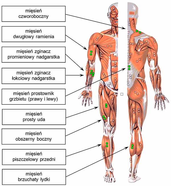 Rys. 6. Miejsca przyczepu elektrod EMG dla badanych mięśni.