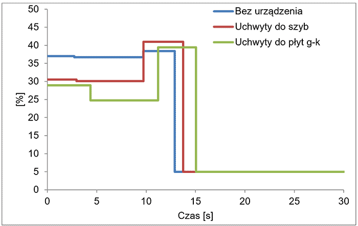 Zastosowanie urządzeń wspomagających powoduje ograniczenie obciążenia podczas przemieszczania ładunków (Tab. 2). Obciążenie to zmniejszyło się z 23,9 % do 14,5 % (chwytak do krawężników, szelki do mebli) podczas przemieszczania ładunku o masie odpowiednio 10 kg oraz z 30,5 % do 15,9 % (szelki do mebli) podczas przemieszczania ładunku o masie odpowiednio 20 kg.