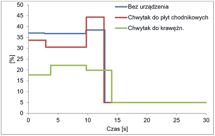 Rys. 8. Wartości obciążenia średniego wszystkich nadanych mięśni [%] w funkcji czasu podczas przemieszczania ładunku o masie 20 kg z zastosowaniem chwytaka do płyt chodnikowych i chwytaka do krawężników oraz bez ich użycia (bez urządzenia).