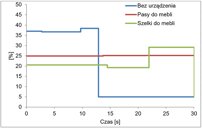 Rys. 9. Wartości obciążenia średniego wszystkich nadanych mięśni [%] w funkcji czasu podczas przemieszczania ładunku o masie 20 kg z zastosowaniem pasów i szelek do mebli oraz bez ich użycia (bez urządzenia).