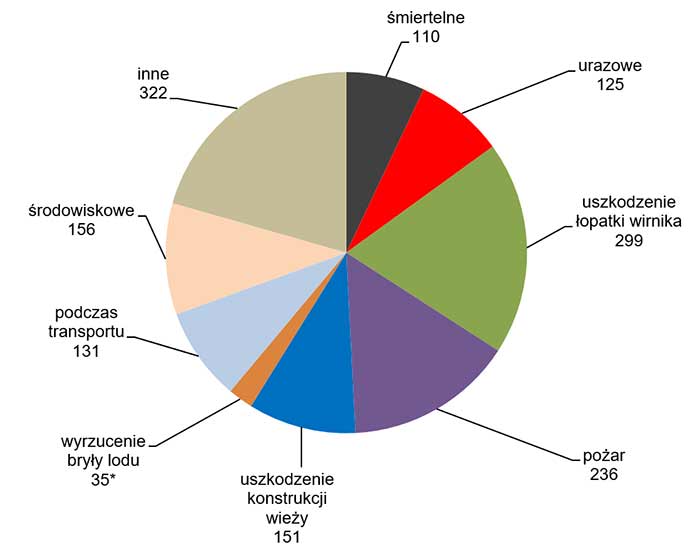 Na świecie notuje się stały wzrost liczby wypadków w elektrowniach wiatrowych zwanych również turbogeneratorami wiatrowymi [3]. W tematycznej bazie Caithness Windfarm [4] zarejestrowano ponad 1,5 tys. zdarzeń wypadkowych i różnego typu awarii związanych z elektrowniami wiatrowymi. Dotyczą one m.in. wypadków podczas prac transportowych, upadków, przygnieceń, przypadków uderzenia oderwaną z wirnika bryłą lodu, uszkodzeń konstrukcji (złamania wieży lub łopatki turbiny) oraz innych uszkodzeń mechanicznych, pożarów i eksplozji, przekroczeń dopuszczalnego hałasu oraz awarii elektrycznych (rys.1).