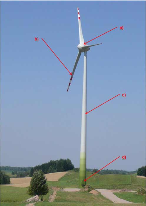 Rys. 2. Typowa elektrownia wiatrowa z poziomą osią obrotu: a) gondola; b) łopata turbiny; c) wieża; d) wejście do wieży.