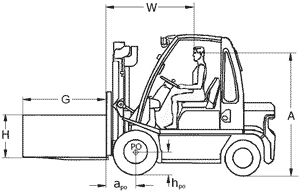 odległość apo położenia osi obrotu PO płaszczyzny oporowej ładunku od tej płaszczyznynależy wziąć z danych producenta podnośnikowego wózka jezdniowego czołowego lub zmierzyć za pomocą uniwersalnych przyrządów pomiarowych (np. wysokościomierza, suwmiarki) z niepewności a wynoszącą ± 0,001 m;