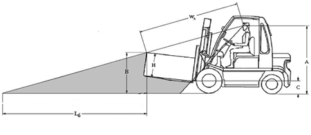 - B - wysokość położenia najwyższej krawędzi ładunku znajdującego się na widłach wózka;