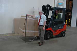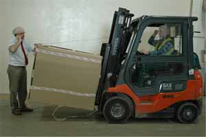 W celu sprawdzenia, czy wysokość B jest zawarta w granicach określonych w Tablicy 2, wystarczy zmierzyć tę wysokość jak to zilustrowano na rys. 1 z zastosowaniem przymiaru liniowego o długości 1,5 m. Jeśli wartość wysokości B przekracza dopuszczalną wartość o kilka cm, rozwiązaniem może być zmniejszenie wysokości C położenia ładunku – zależy to od jakości podłoża, po którym będzie się poruszał wózek. Jeśli zaś nie można zmniejszyć wartości C, to dany ładunek nie powinien być przewożony na wózku, ponieważ ryzyko kolizji wózka z osobą pieszą, innym wózkiem czy elementem infrastruktury jest zbyt duże, ze względu na niewystarczającą widoczność otoczenia przez operatora wózka z danym ładunkiem.