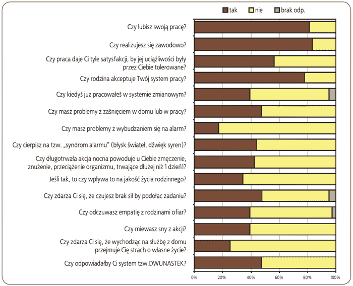 W celu zbadania jak strażacy-ratownicy subiektywnie oceniają wybrane aspekty swojej pracy przeprowadzono badania ankietowe w losowo wybranych komendach powiatowych Państwowej Straży Pożarnej5. W tym dobrowolnym i anonimowym badaniu uczestniczyło 36 mężczyzn w wieku od 26 do 50 lat, ze stażem pracy od 2 do 26 lat. Wszyscy uczestniczyli w akcjach ratowniczo-gaśniczych prowadzonych przez macierzyste jednostki i wykonywali pracę w systemie zmianowym: 24 godziny służby i 48 godzin wolnych od pracy. Pytania w ankiecie sformułowano tak, by umożliwiały ocenę subiektywnych odczuć strażaków-ratowników dotyczących wybranych problemów (uciążliwości) związanych z pracą w systemie obowiązującym w Państwowej Straży Pożarnej, w powiązaniu ze specyfiką zawodu strażaka-ratownika.