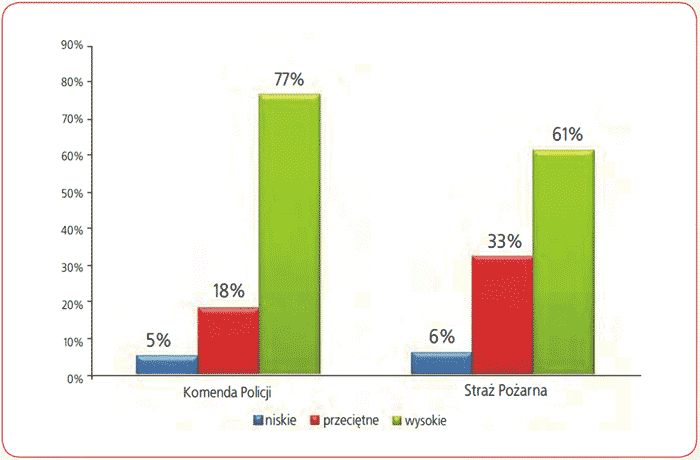 Na podstawie uzyskanych wyników badań ankietowych można było stwierdzić, że natężenie stresu oceniane za pomocą skali PSS 10 nie różniło się istotnie pomiędzy badanymi grupami respondentów (dokładny test Fishera; p >0,05). W obu grupach dominowały wysokie wskaźniki natężenia stresu; odpowiednio 51% u pracowników straży pożarnej i 77% u policjantów. Niskie wyniki wśród respondentów to rzadkość - 5% u pracowników policji i 5% wśród pracowników straży pożarnej (rys.).