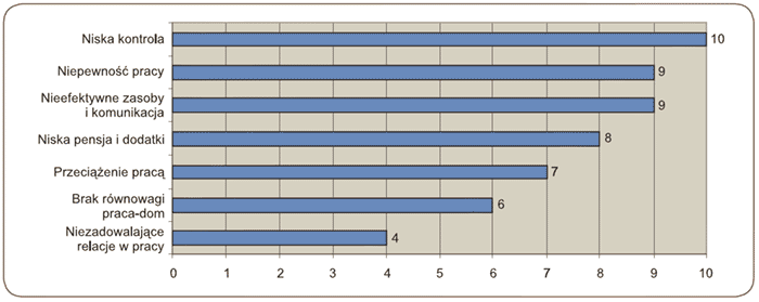 Badani strażacy jako źródło stresu większe niż w ogólnej populacji osób pracujących wskazali niską kontrolę nad swoją pracą, niepewność pracy, nieefektywne zasoby i komunikację w organizacji oraz niskie pensje i dodatki (rys).