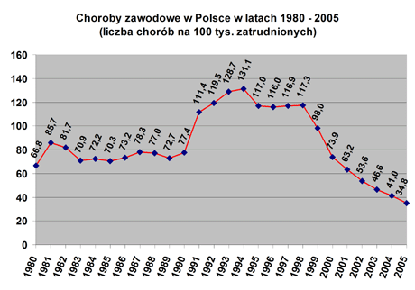 Roczny współczynnik zapadalności wyniósł 34,8 przypadków na 100 tys. zatrudnionych. Zapadalność na choroby zawodowej zmniejszyła się o 15,1% w porównaniu do 2004 r.