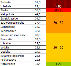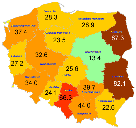 Najwyższe współczynniki zapadalności na choroby zawodowe na 100 tys. zatrudnionych odnotowano w województwach: podlaskim (87,3), lubelskim (82,1), śląskim (66,3), zaś najniższy współczynnik odnotowano w województwie mazowieckim (13,4).