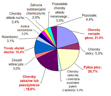 W 2005 roku zanotowano w Polsce łącznie 3249 przypadków chorób zawodowych. Poniżej przedstawiono procentowy udział w tej liczbie najczęściej występujących jednostek chorobowych.