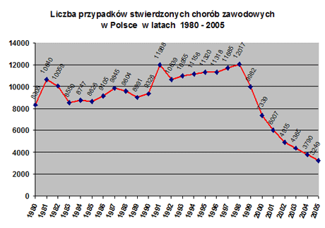 Jak wynika z opracowania pt. „Choroby zawodowe w Polsce w 2005 roku” przygotowanego przez Instytut Medycyny Pracy w Łodzi – w 2005 r. stwierdzono w Polsce 3249 przypadków chorób zawodowych. Większość chorób zawodowych powstała w wyniku wieloletniej ekspozycji na czynniki szkodliwe i uciążliwe. Choroby zawodowe według Polskiej Klasyfikacji Działalności przedstawia rysunek 7.