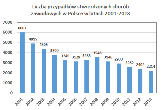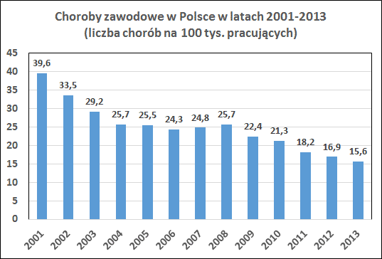 Źródło danych: Szeszenia-Dąbrowska N., Wilczyńska U., Sobola W.: Choroby zawodowe w Polsce w 201 Sr., Instytut Medycyny Pracy im. prof. J. Nofera, Centralny Rejestr Chorób Zawodowych, Łódź, 2014.