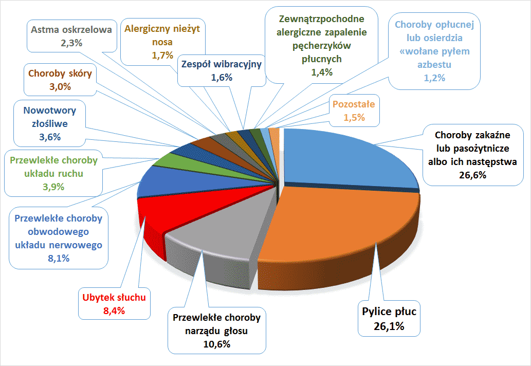 W 2013 roku zanotowano w Polsce łącznie 2214 przypadków chorób zawodowych. Na Rys. 4 przedstawiono procentowy udział w tej liczbie najczęściej występujących jednostek chorobowych.