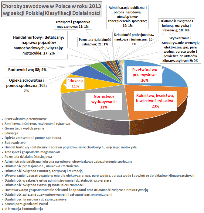Rys. 5. Procentowy podział liczby przypadków chorób zawodowych stwierdzonych w 2013 r. według Polskiej Klasyfikacji Działalności