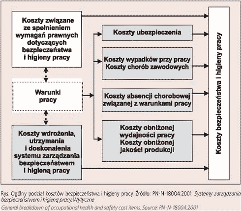 Dla przedsiębiorstw koszty nieodpowiednich warunków pracy stanowią dodatkowe koszty produkcji, które mogą wpływać na ceny wyrobów i usług. Na koszty te, zgodnie z normą PN-N-18004:2001, składają się m.in. koszty: ubezpieczenia wyrażone w składkach na społeczne ubezpieczenie wypadkowe, wypadków przy pracy i zdarzeń potencjalnie wypadkowych, chorób zawodowych, świadczeń z tytułu pracy w warunkach szkodliwych i uciążliwych, zwiększonej absencji chorobowej spowodowanej warunkami pracy, obniżonej wydajności pracy i jakości produkcji, które w efekcie powodują zaburzenia toku produkcji i podrażają jej koszt, a ponadto pogarszają wizerunek firmy.