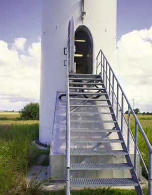 Turbiny te instalowane są zwykle na terenach, gdzie występuje zarówno duża prędkość wiatru, jak i liczba wietrznych dni w roku, aby wytwarzanie energii elektrycznej tą metodą było jak najbardziej stabilne i opłacalne ekonomicznie. Także w celu zwiększenia efektywności, turbiny wiatrowe wraz z generatorami instalowane są wysoko ponad poziomem terenu - w Polsce typowo w tzw. gondoli, na szczycie cylindrycznej wieży o średnicy kilku i wysokości 50 - l00 metrów. Najwyżej w kraju zainstalowano turbinę na wysokości 160 m. Zestaw „turbina wiatrowa - generator prądowy", wraz z niezbędnym wyposażaniem elektroenergetycznym zlokalizowanym wewnątrz wieży (fot.), nazywany jest elektrownią wiatrową, a grupa takich obiektów tworzy tzw. farmę wiatrową.