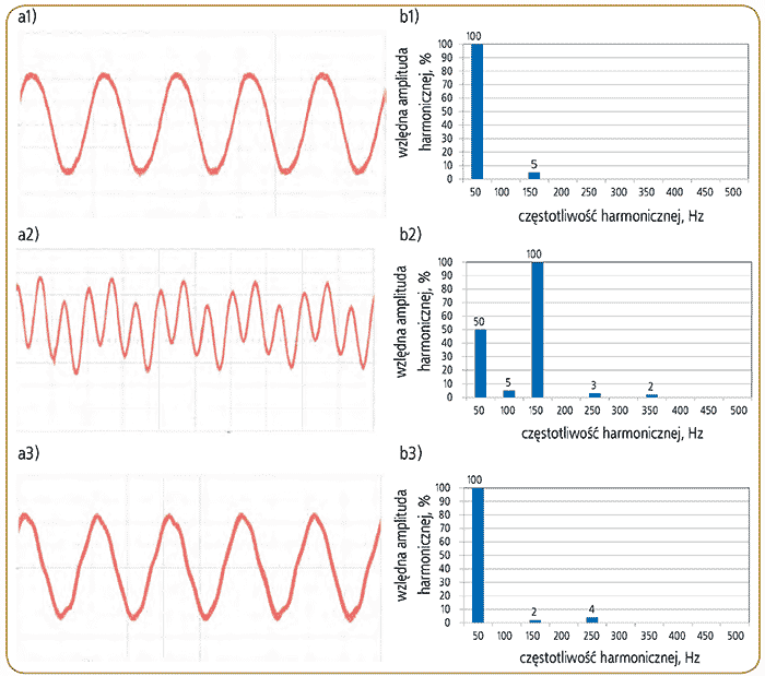 Rys. 1. Przebiegi zmienności w czasie pola magnetycznego, zarejestrowane w otoczeniu wyposażenia elektrowni wiatrowej z asynchronicznym generatorem szybkoobrotowym - odpowiednio od góry: al) przy generatorze: a2) przy kablach 690 V wyjściowych z generatora; a3) przy kablach SN z transformatora wyjściowego (podstawa czasu: 10 ms/dz) (a) i jego widmo amplitudowo-częstotliwościowe (b) - rejestracje sondą o paśmie przenoszenia 1 Hz - 400 kHz
