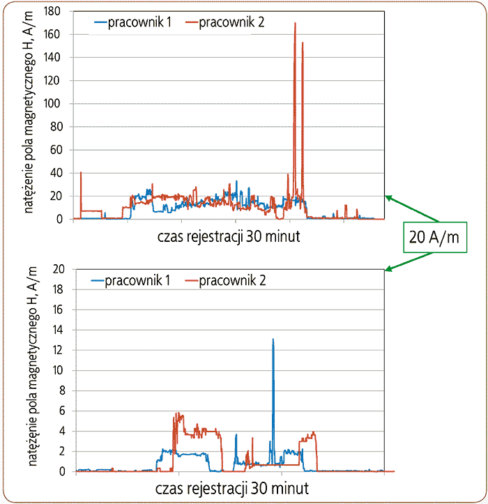 Podczas oceny zasięgu pola-M-SO istotne znaczenie ma jego częstotliwość, z uwagi na zróżnicowanie wartości limitów - na przykład przy częstotliwościach 50 Hz i 150 Hz dolne limity stref ochronnych wynoszą odpowiednio: 60 A/m i 20 A/m; a limity strefy niebezpiecznej 3200 A/m i 1067 A/m [6]. W otoczeniu wyposażenia elektrowni wiatrowych (bezpośrednio przy przetwornikach DC/AC, AC/AC oraz okablowaniu niskiego napięcia generatorów i przetworników) zmierzono natężenia pola-M przekraczające 200 A/m. W przypadku niejednoznacznego rozpoznania charakterystyki pola-EM jego ocenę przeprowadza się w odniesieniu do najniższych wartości limitów z rozpoznanego pasma częstotliwości [7]. W omawianym przypadku oznacza to zastosowanie kryteriów dotyczących częstotliwości 150 Hz, a w konsekwencji stwierdzenie występowania pola-M-SO w odległości do 60 cm od wspomnianych źródeł.