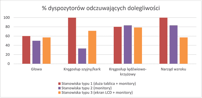 Ankieta online (Ergotest.pl) przeprowadzona w 2016 roku wykazała, że 31% codziennie odczuwa problemy związane z nieprawidłowo zaprojektowanym stanowiskiem pracy z komputerem. Są to najczęściej: bóle pleców (72%), bóle głowy (47%), bóle karku (51%) i napięcie w ramionach (37%). Badania przeprowadzone w CIOP-PIB wskazują, że częstość występowania dolegliwości w znacznej mierze zależy od organizacji przestrzennej i spełnienia zaleceń ergonomii na stanowisku pracy. W badaniach porównano trzy rodzaje stanowisk dyspozytorskich (Rys. 1). Najczęściej dolegliwości układu mięśniowo-szkieletowego odczuwali pracownicy na stanowiskach wyposażonych nie tylko w monitory ustawione na biurku, ale także duże tablice z wyświetlaczami, które umieszczone były do wysokości ponad 3 metrów nad podłogą (stanowiska typu 1). Prawie tak samo niekorzystne dla zdrowia były stanowiska, gdzie oprócz monitorów informacje wyświetlane były na dodatkowych monitorach LCD o przekątnej ponad 100” (stanowiska typu 3). Tam, gdzie praca obejmowała wykorzystanie wielu monitorów, ale ustawionych obok siebie (stanowiska typu 2), pracownicy skarżyli się przede wszystkim na bóle głowy i oczu oraz kręgosłupa lędźwiowego związane z utrzymywaniem pozycji siedzącej. Zdecydowane rzadziej skarżyli się na dolegliwości kręgosłupa szyjnego, piersiowego czy barków.