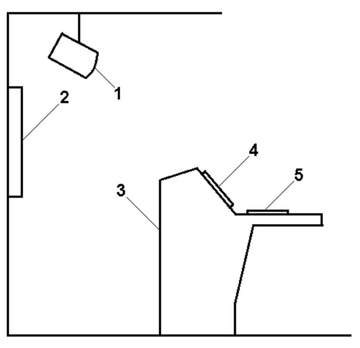 Rys. 2. Schemat stanowiska sterowania wraz z pozastanowiskowymi wskaźnikami wizualnymi (1 – wskaźnik wizualny pozastanowiskowy, 2 – ekran informacyjny, 3 – konsola sterownicza, 4 – wskaźnik wizualny, 5 – pulpit sterowniczy).