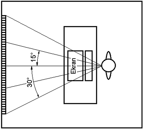 Rys. 3. Schemat stanowiska sterowania – zalecane kąty obserwacji – widok z góry (kąty dla wskaźników stanowiskowych – 15° i pozastanowiskowych – 30° w płaszczyźnie poziomej).