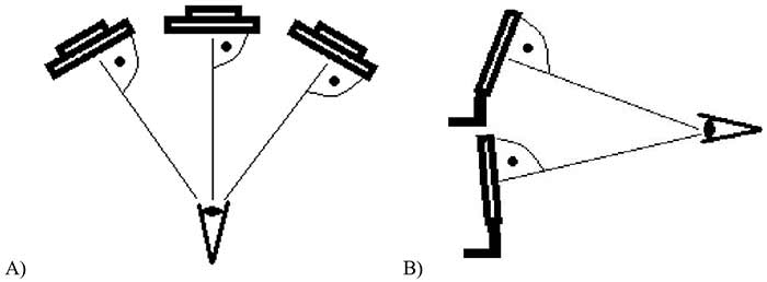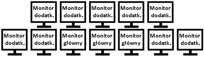 Każdy z monitorów, z których korzysta pracownik powinien być ustawiony prostopadle do linii widzenia. Ustawienie prostopadle do linii widzenia dotyczy zarówno monitorów znajdujących się po lewej i po prawej stronie monitora głównego lub monitorów głównych, jak i ustawionych powyżej monitorów głównych (Rys. 5). Ustawienie każdego z obserwowanych monitorów prostopadle do linii widzenia powoduje, że na ekranie monitorów nie powinny występować odbicia źródeł światła sztucznego lub naturalnego. Ponadto takie ustawienie każdego z monitorów powoduje, że zarówno cyfry, jak i litery umieszczone na ekranie są czytelne. Ustawienie ekranów monitorów w jednej płaszczyźnie powoduje, że im dalej monitor oddalony jest od pracownika, tym czcionki na ekranie monitora są mniej czytelne. Ma znaczenie szczególnie w przypadku tańszych monitorów, których kąty widzenia są mniejsze w pionie i w poziomie.