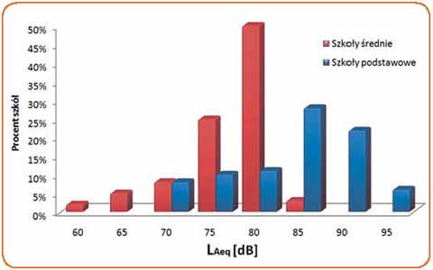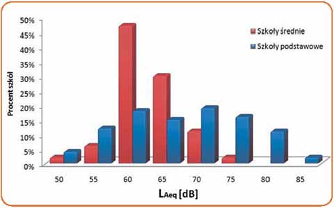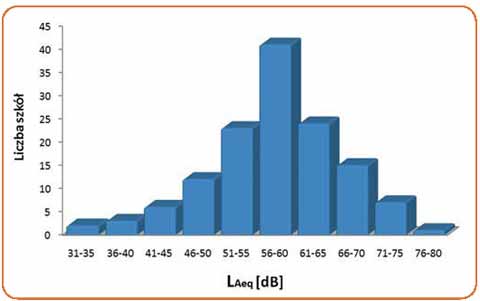 Badania hałasu w szkołach, przeprowadzone w ostatnich latach przez Instytut Medycyny Pracy i Zdrowia Środowiskowego w Sosnowcu [8, 9], potwierdziły występowanie niekorzystnego klimatu akustycznego w szkołach. Średnie równoważne poziomy dźwięku A mierzone w pustych klasach (obrazujące wartości poziomów hałasu tła) w szkołach podstawowych wyniosły 42±1,7 dB, a w szkołach ponadpodstawowych 40±1,2 dB. Natomiast średnie równoważne poziomy dźwięku A mierzone w klasach w czasie prowadzenia zajęć wyniosły 71±6 dB w szkołach podstawowych i 62±10 dB w szkołach ponadpodstawowych. Najwyższą wartość średniego równoważnego poziomu dźwięku A -76±4,4 dB zmierzono w trakcie prowadzenia zajęć w salach gimnastycznych.