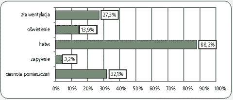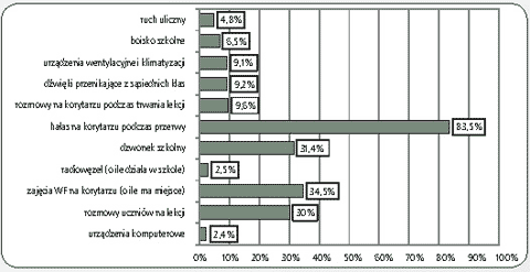 Oceniając czynniki środowiska pracy jako główne źródła uciążliwości i dyskomfortu, ankietowani nauczyciele wskazali hałas (88,2%), ciasnotę pomieszczeń (32,1%), złą wentylację (27,3%), oświetlenie (13,9%), (rys. 1.). Za najbardziej uciążliwe źródła hałasu w szkole ankietowani uznali hałas na korytarzu podczas przerwy (83,5%), zajęcia wf na korytarzu (34,5%), dzwonek szkolny (31,4%), rozmowy uczniów na lekcji (30%), (rys. 2.).