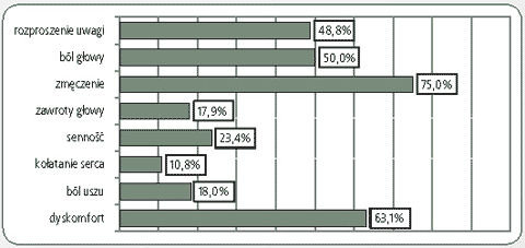 Powyżej 70% ankietowanych oceniło hałas w szkołach jako głośny lub bardzo głośny, irytujący, denerwujący i rozpraszający uwagę i koncentrację. Znaczny odsetek nauczycieli ocenił, że hałas szkolny utrudnia prowadzenie lekcji (68,9%), zakłóca rozmowę (64,8%), zwiększa wrażliwość na dźwięki w sytuacjach pozaszkolnych (62,5%). 106 ankietowanych nauczycieli (59,6%) było zdania, że hałas jest powodem dolegliwości i problemów z głosem. Oceniając dolegliwości i odczucia, których przyczyną może być hałas szkolny, 75% ankietowanych uznało, że hałas wywołuje zmęczenie, 63,1% - dyskomfort, 50% - bóle głowy i 48,8% - rozproszenie uwagi (rys. 3.).