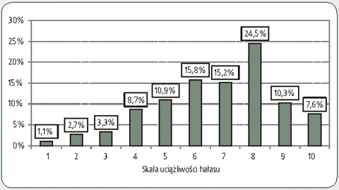 Oceniając uciążliwość hałasu w skali 1-10, 42,4% nauczycieli było zdania, że hałas jest bardzo uciążliwy lub trudny do wytrzymania (skala uciążliwości 8 i powyżej, rys. 4). Zaledwie 7% nauczycieli oceniło hałas jako nieuciążliwy lub mało uciążliwy (skala uciążliwości 3 i poniżej).