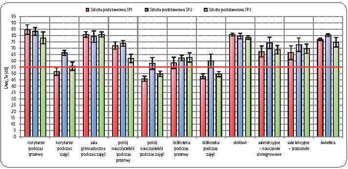 Rys. 5. Równoważne poziomy dźwięku A, LAeq,Te, na stanowiskach pracy nauczycieli w badanych szkołach podstawowych (kryterium uciążliwości hałasu – LAeq,Te = 55 dB)
