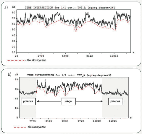 Rys. 6. Przykładowe przebiegi czasowe poziomu dźwięku A w klasach: a) zajęcia zintegrowane, b) lekcja historii