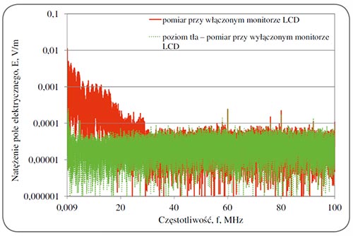 Pasmo częstotliwości pola elektromagnetycznego emitowanego przez monitory LCD jest znacznie szersze niż to, co uwzględniono w wymaganiach TCO (powyżej 400 kHz do kilkudziesięciu MHz), (rys. 1.). Również w ich przypadku natężenie emitowanego pola elektrycznego i magnetycznego w całym paśmie częstotliwości, zmierzone szerokopasmowo w paśmie częstotliwości 9 kHz-100 MHz, w odległości 10 cm przed ekranem 20 monitorów LCD, nie przekracza jednak 1 V/m i 0,01 A/m. Jest to pole znacznie słabsze od limitów IPNp - minimalna wartość limitu IPNp dotyczącego pola o częstotliwości przekraczającej 3 MHz, wynosi odpowiednio 7 V/m i 0,02 A/m [3].