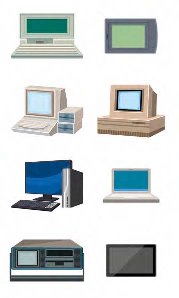 Z upływem czasu przybywały nowe urządzenia peryferyjne: myszki, drukarki, skanery. Monitor ekranowy, początkowo wyposażony w lampę kineskopową CRT (Catode Ray Tube), a później w ekran ciekłokrystaliczny, płaski, typu LCD (Liquid Crystal Display) lub w ekran bazujący na wprowadzanej obecnie technologii typu OLED (Organic Light-Emitting Diode), a także jednostka systemowa (zawierająca procesor, pamięci, karty i interfejsy do obsługi urządzeń peryferyjnych), mogą być urządzeniami niezależnymi bądź zintegrowanym (tzw. komputery All-In-One, AIO). W przestrzeni pracy z zestawem komputerowym coraz częściej można spotkać też zasilacze awaryjne, tzw. UPS (Uninterruptible Power Supply), zaopatrujące urządzenia w energię elektryczną w przypadku chwilowych braków energii elektrycznej [1].
