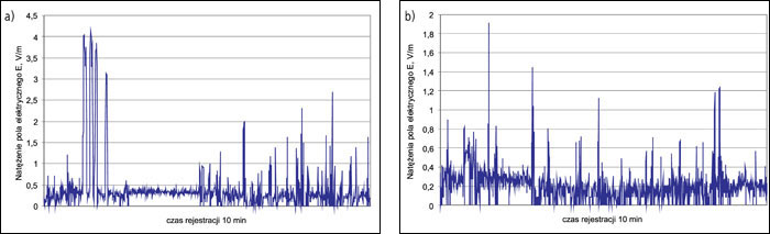 Rys. 2. Przykładowe wyniki rejestracji wartości skutecznej natężenia pola elektrycznego o częstotliwości z pasma 100 kHz - 3 GHz na stanowiskach dyspozytorów punktów alarmowania jednostek ratowniczo-gaśniczych PSP na terenie Warszawy: a) antena nadawcza radiotelefonu stacjonarnego na zewnętrznym parapecie okna pomieszczenia, w odległości ok. 2 m od stanowiska pracownika; b) antena nadawcza radiotelefonu stacjonarnego na dachu budynku jednostki