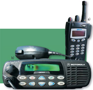 Rozróżnia się 3 podstawowe grupy urządzeń radiotelefonicznych (fot.), a mianowicie radiotelefony przenośne (o niewielkich rozmiarach i masie, o mocy wyjściowej nieprzekraczającej 5 W, wykorzystywane do zapewnienia łączności na niewielkim obszarze działania), radiotelefony przewoźne o konstrukcji pozwalającej na montaż w pojazdach, o mocy wyjściowej nieprzekraczającej 25 W, mogą być wykorzystywane jako stacjonarne) oraz radiotelefony stacjonarne - instalowane w obiektach stałych, wyglądem zewnętrznym przypominające zazwyczaj szafę lub stojak z manipulatorami, o mocy wyjściowej nieprzekraczającej 30 W.