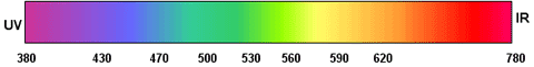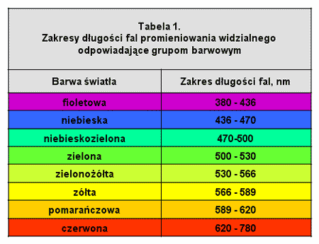 Natomiast w przypadku promieniowania widzialnego nie ma ściśle określonych granic lecz najczęściej przyjmuje się jego zakres jako przedział o długości fali od 380 nm do 780 nm. Nie wprowadza się też podziału na podzakresy A, B i C. Każdej długości fali promieniowania widzialnego odpowiada inna barwa światła (patrz rys. 2), które można pogrupować na grupy barwowe przedstawione w tabeli 1.