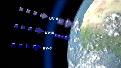 Promieniowanie nadfioletowe dzielone jest na 3 pasma (Rys. 1): UV-C, UV-B i UV-A. Całość promieniowania UV-C oraz znaczna część promieniowania UV-B jest pochłaniana w atmosferze przez ozon, parę wodną, tlen i dwutlenek węgla. Ozon jest głównym pochłaniaczem promieniowania UV-B, zmniejszenie jego warstwy w atmosferze zwiększa ilość UV-B docierającego do powierzchni Ziemi. Promieniowanie UV-A jest minimalnie pochłaniane w atmosferze. W związku z tym promieniowanie UV docierające do człowieka składa się głównie z UV-A i UV-B.